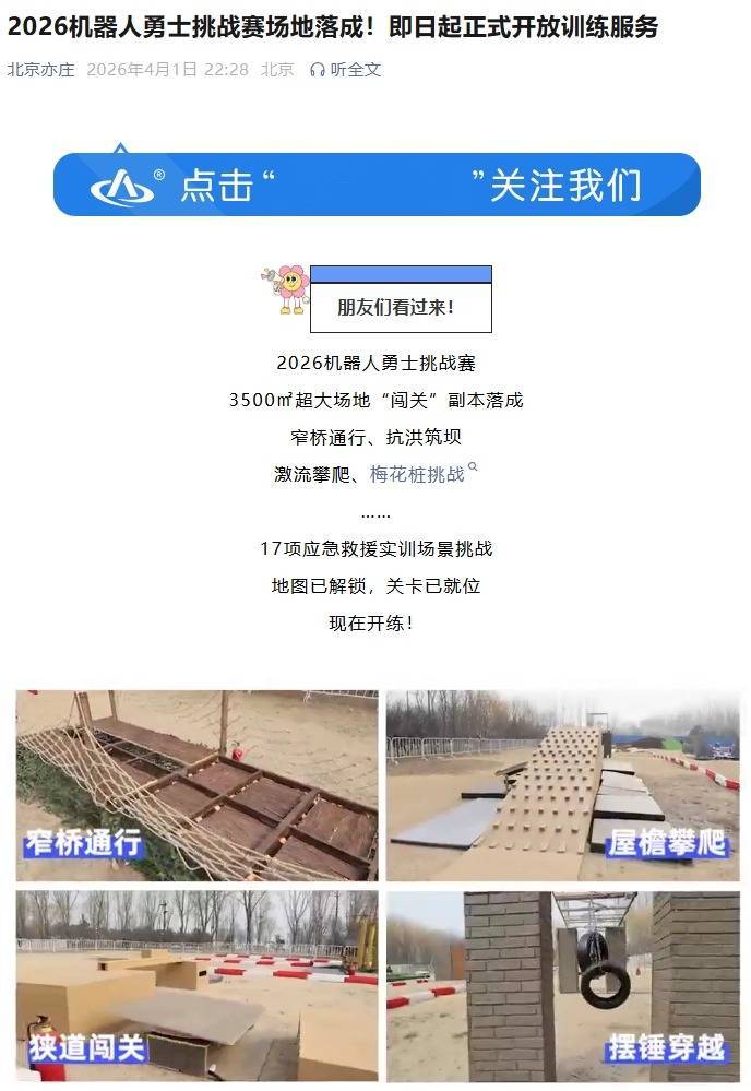 IT之家 4 月 2 日消息,“北京亦庄”公众号昨晚发文,日前,2026 机器人勇士挑战赛完成全部场地搭建工作,赛事场地于南海子公园熏风园(原二期)正式落成,并按计划开启对外训练服务,为各参赛队伍提供专业、标准化的赛前实训场地,标志着这场机器人领域的专业赛事进入赛前冲刺阶段。